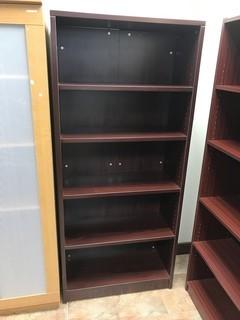 Lot #0552:     Single Pedestal Desk w/ Overhead, Task Chair and 5-shelf Bookcase.