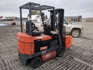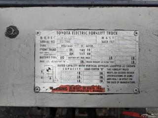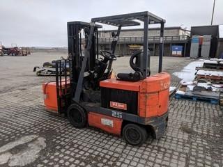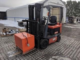 Lot #0099: Toyota 5FBCU25 4300 LB Electric Forklift c/w Barry Charger. Solid Tire. Showing 14,330 Hours.