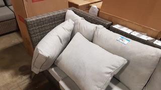 Lot #5561: Grey Rattan Patio Set - w/Grey Cushions - w/Dining Table & 3 Ottoman Seats