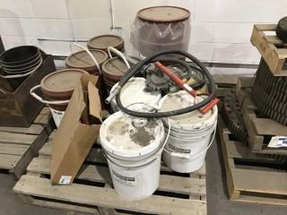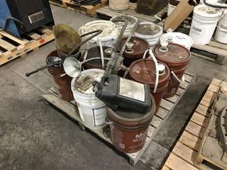 Lot #0990: Lot of (2) Pallets of Asst. Pails of Oil, Pail Pumps, Keg of Grease, etc.