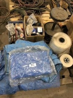 Lot #0773: Pallet of Asst. Tarps, Shop Stools, Files, Chalk Line, etc.