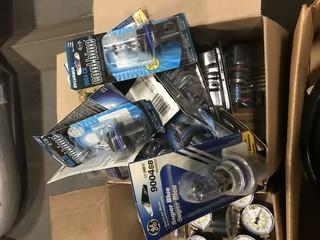 Lot #0602:     Lot of Asst. Headlight Bulbs, Electric Motors, Gauges, etc. **LOCATED IN EDMONTON**