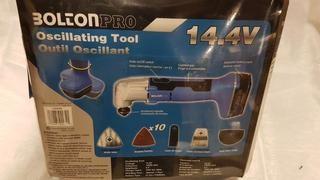 Lot #1628: BOLTON PRO 14.4V OSCILATING TOOL WITH ANGLE CUTTING BLADE, SANDER PADS, CUTTER BLADE, SCRAPER & 1/2 ROUND CUTTER BLADE-CB12-2022