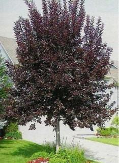 Lot #3811: Basketed Schubert Chokecherry. Features beautiful purple-red leaves throughout the summer. This small tree is well-suited as an ornamental for city yards.