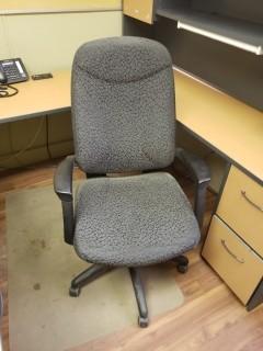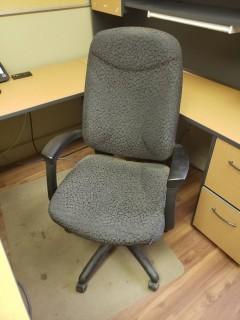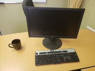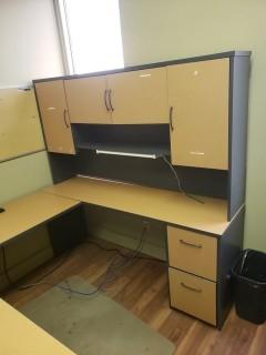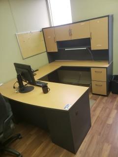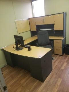 Lot #2840: Contents Of Office C/w U Shaped Desk & Hutch, Task Chair, Monitor, Wood Shelf ***Note: Phone Not Included***