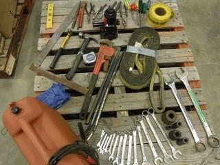Lot #1532: Assorted Shop Tools, Includes Wrenches, Pliers, Pipe Wrench , Bottle Jack, Screw Drivers, Booster Cables and More, *Located RW11*