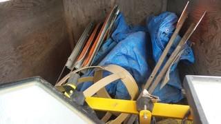 Lot #2384: Crate with Lights, Tarps, Signs and Metal PC'S