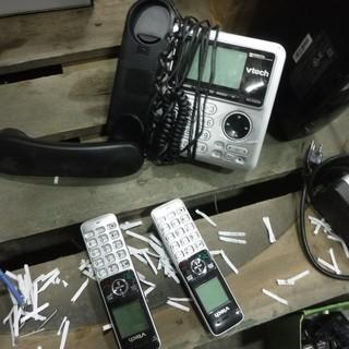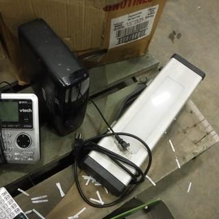Lot #1776: Office Supplies, Epson Fax Machine, Cannon Multi Function Printer, Wireless Amp, Phone c/w 2 Cordless Hand Held Phones and Charges, Flash Lights and Binders, *Located REE14*