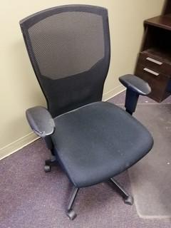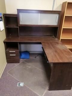 Lot #2820: L-Shaped Wood Office Desk C/w Hutch And Task Chair