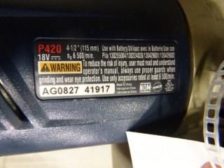 Lot #2127: Ryobi 4.5" Cordless Angle Grinder, 18V c/w Battery, Grip, Grinder Guard, and Used 4" Grinding Disc and Charger, Model P420, SN AG0827 41917 (Positional Battery Pack) (W-2-4-2)