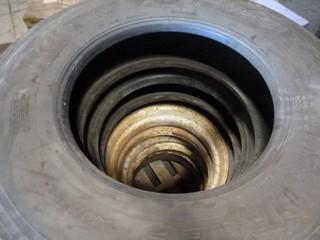 Lot #0030D: (3) Assorted Semi Tires w/ Budd Rims, (2) Without Rims *NOTE: Tread Worn Out*