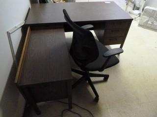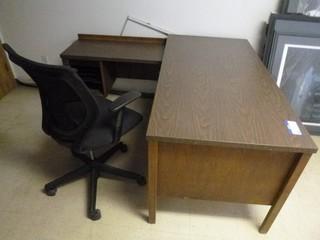 Lot #0835: L Shape Office Desk c/w 5 Drawers, Chair and Lexmark Printer, 60" x 30" and 39" Side Unit