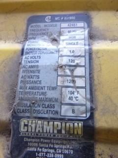 Lot #2108: Champion Gasoline Generator, Model 42451, 1200W, 120V, S/N 11JUL2002498