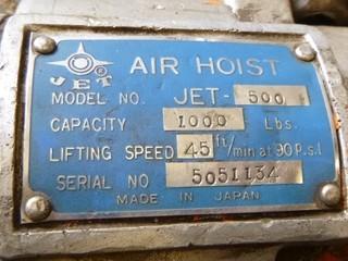 Lot #3821: (1) Air Hoist, Model JET-500, 1000LB Capacity, SN 5051134, (1) Air Hoist, Model ML1000K-2030-015S, 1 Ton Capacity, SN SP992-0303-00 (W2-3-3)