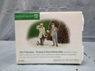 Lot #2644: Department 56, " Twinkle Lit Trees", " Pennyfarthing Pedaling", " Ale Mates" " City Professions - Postman & Dairy Delivery Man" Ornamental Collectables (E5-1-1)