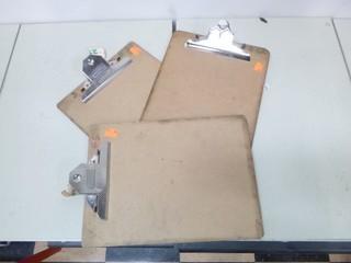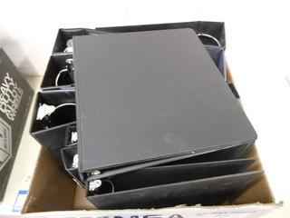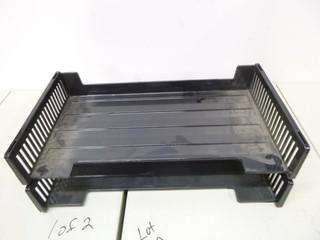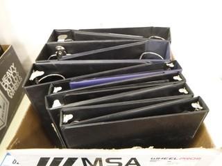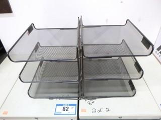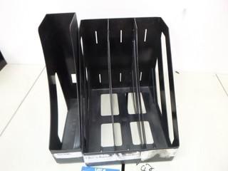 Lot #0082A: 2 Metal Desk Organizers w/ Magazine Dividers, Qty of Various Size Binders, 7 Wooden Clip Boards, 11 Stackable Desk Trays