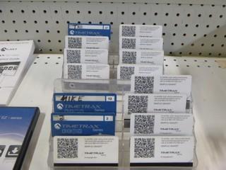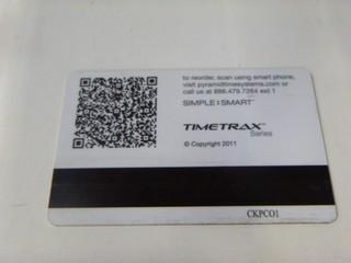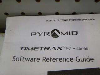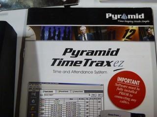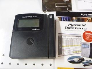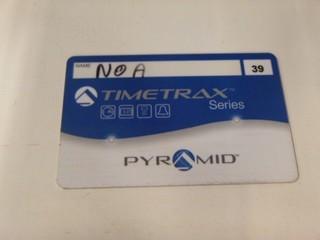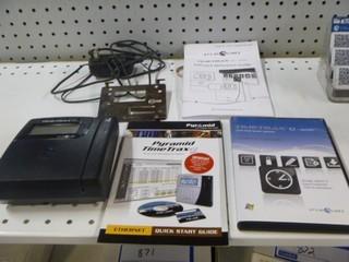 Lot #0865: Ethernet Timecard system with Credit Card Style Swipe System. Pyramid Timetrax Series Timeclock System c/w Clock In Station, Multiple Time Cards, Stands, and Software. Can be used remotely through Internet, Will work for over 100 Employees