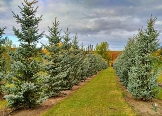 Lot #4268: (1) 3.5m - 4.5m Bakeri Spruce Basketed Tree. Purchase April 28th, Available For Pick Up Early May.