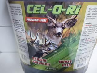 Lot #8157: 4 LTR Cell-O-Ri Moose & Deer Attractant, 4.5lbs Deer Cane Black Magic Attractant