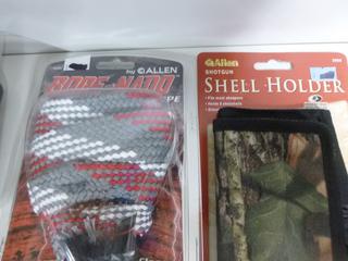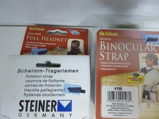 Lot #8177: (5 pcs) Floatation Strap, Full Headnet, Binocular Strap, Shot Shell Holder, 12 ga Barrel Cleaning Rope