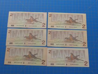 Lot #7035: (6) $2 Canadian Bills