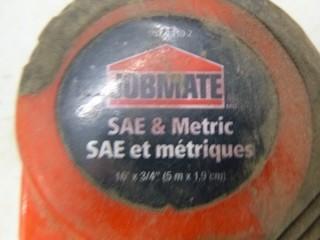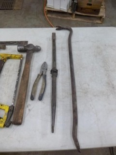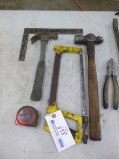 Lot #0648: Qty Of Assorted Hand Tools Includes: Hammers, Square, Pry Bars, Hand Saw And Tape Measure