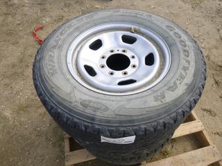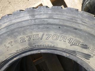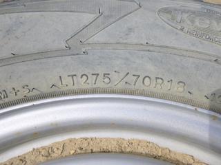 Lot #0677: (2) Toyo M-55 LT 275/70R18 Tires, (1) Goodyear Wrangler LT 275/70R18 Tire w/ 8 Stud Rim, (WR-1)