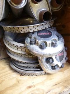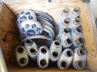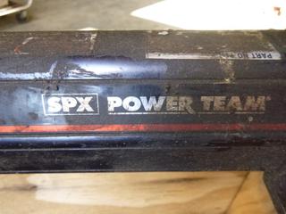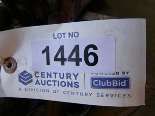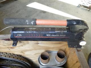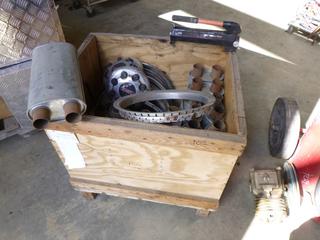 Lot #1446:     Qty of Muffler PCs, (2) GMC Hub Caps, Qty of Rim Trim, Tire Iron, SPX Power Team P19L Pump (Fichtenberg/Higher Ground Acreage Dispersal), (WR-4)