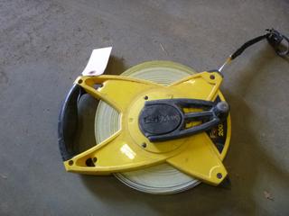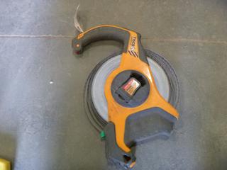 Lot #2121: Transit Level Tripod, Greenlee Fish Tape, Stanley Fat Max 200' Measuring Tape, Stanley 100' Tape Measure, Fisco 330' Surveyor Tape Measure