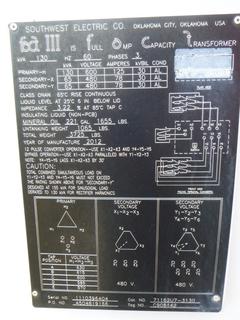 Lot #0747: Full Amp Capacity Transformer, 3 Phase, 60 HZ, SN 1110396404