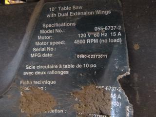 Lot #0327: Mastercraft 055-6737-2 10" Table Saw, 120V, 60 HZ, 15A *NOTE: Damaged, Running Condition Unknown*