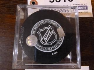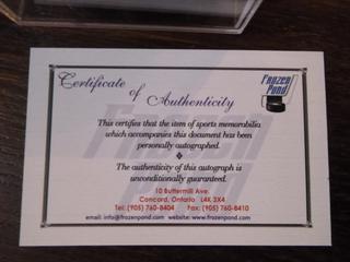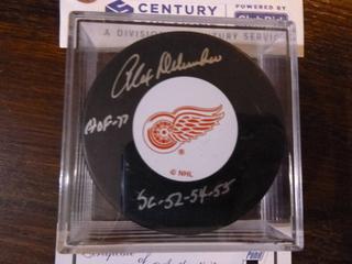 Lot #3316:     Alex Delvecchio Signed Detroit Red Wings Puck.  C.O.A. From Frozen Pond.  Inscribed "HOF-77" and "SC-52-54-55"