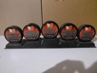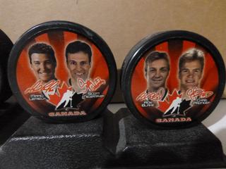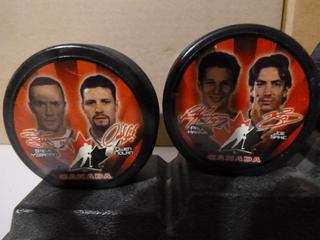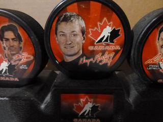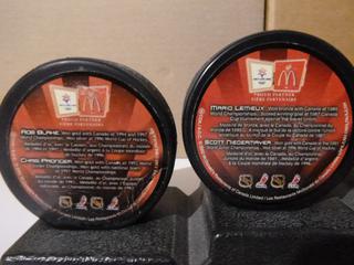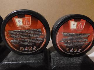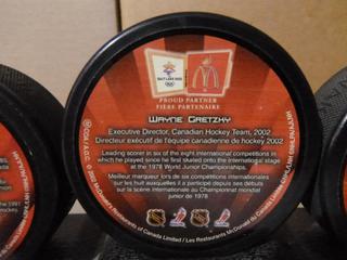 Lot #3285:     Complete Set (5 of 5) of McDonald's 2002 Salt Lake City Team Canada Olympic Pucks.  Featuring Wayne Gretzy, Mario Lemieux, Scott Niedermayer, Paul Kariya, Joe Sakic, Rob Blake, Chris Pronger, Steve Yzerman and Owen Nolan, C/w Original Stand