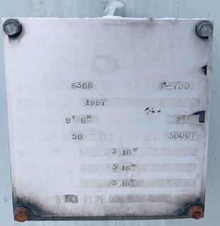 Lot #0125A: 1997 Argo Sales 9'6" x 4' 50 BBL tank 3/16" Floor, shell and roof, Weight 3,000 pounds s/n 6386. Note* Buyer responsible for loading and freight. Located at 5704 54 St, Taber, AB