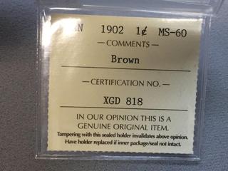 Lot #5517: 1902 Canada One Cent Coin (Rated MS60).