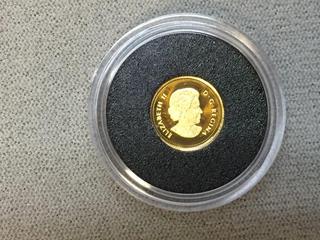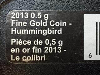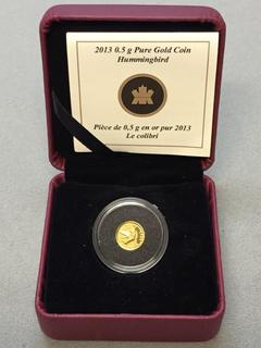 Lot #5592: 2013 Canada 0.5 Gram Pure Gold Twenty Five Cent Humming Bird Coin c/w Display Case.