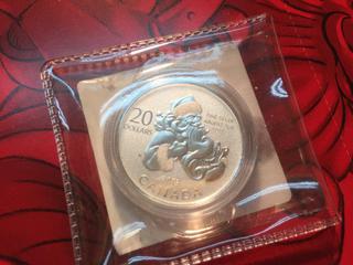 Lot #5379: 2013 Canada Twenty Dollar .9999 Fine Silver Coin, Santa, Unopened.