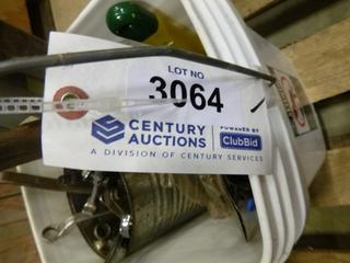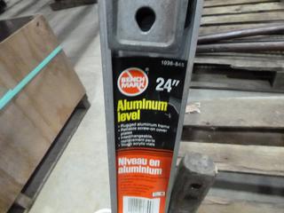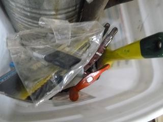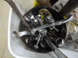Lot #3064: (1) 4 Ft Level, (2) 2 Ft Level, (1) Torpido Level, (1) Pully Set Puller, Qty of Wrenches in Bucket, Hammer, Allan Keys, Scrapers, Plyers (K-2-3)