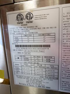 Lot #1083: Model ATO-36GCAH1 36in Range w/ Griddle And Standard Oven- NG Pick up for this Item Wednesday November 18, 2020