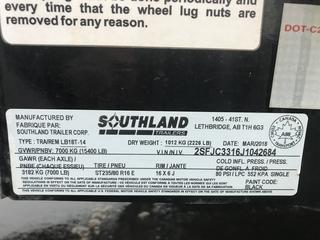 - 0101A: 2018 Southland LB18T-14 18' T/A Flat Deck Equipment Trailer c/w Fold up Ramps, ST235 80 R16 E Tires, GVWR 7000KG (15400 LB) 2 x 3182 KG (7000 LB) Axles, 1 -5000 lb Top-wind Jack, 18-foot Working Deck, 2-5/16” Ball Coupler. S/N 2SFJC3316J1042684.