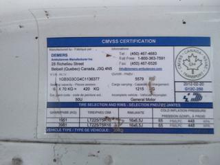 - 0078: 2012 Chevrolet G33803 Ambulance c/w 6.0L Vortec V8, A/T, A/C, Showing 405,195 Kms, 225/75R16 Tires, VIN 1GB3G3CG4C1136377 *Note: Does Not Start, No Kms, Drivers Door Does Not Latch Closed* (Dead Row)