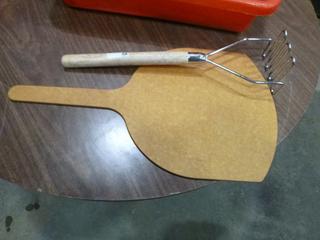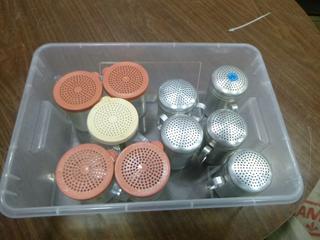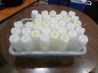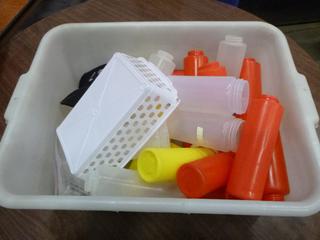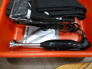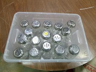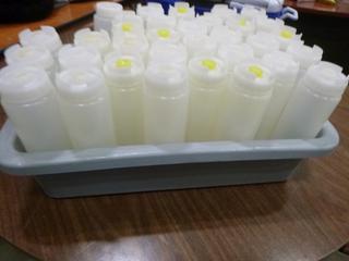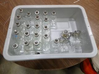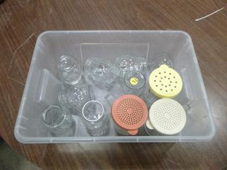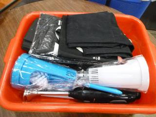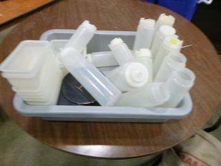 Lot #4252: Assortment of Restaurant/Kitchen Supplies: Shakers, Squeeze Bottles, Pizza Paddle, Hand Blender, Vinegar Bottles, etc. *Note: Bins are Included, But Metal Crate Not Included* (R-5-3)