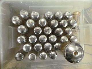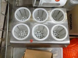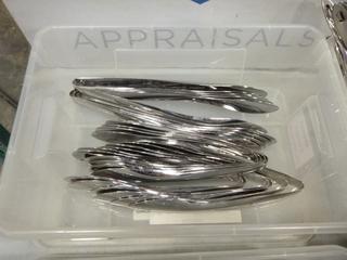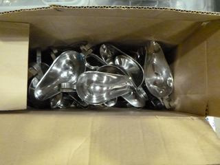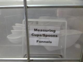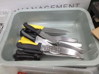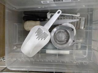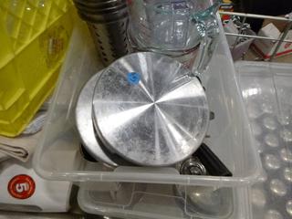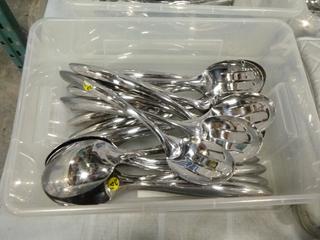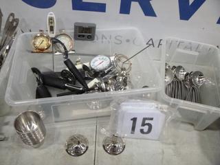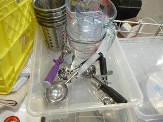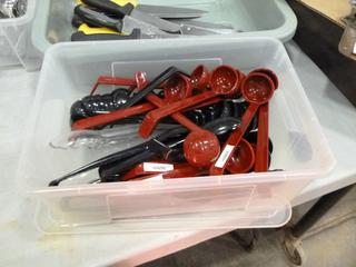 Lot #4288: Qty of Assorted Restaurant/Kitchen Items: Sauce/Gravy Boats, Plastic Baskets, Sugar Package Holders, Ice Cream Scoops, Measuring Cups and Spoons, Pepper Shakers, Knives, Oven Mitts, Zesters, Stainless Serving/Slotted Spoons, Small Plastic and Metal Serving Tongs, Salad Dressing Ladles, etc. *NOTE: Plastic Totes and Bins Included-Metal/Wire Crate Not Included* (K-3-3)