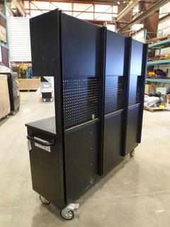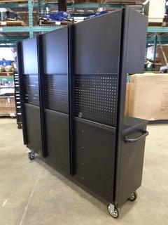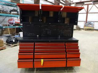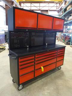 Lot #3056: Unused 72 In. Red Powder Coated Tool Chest with 15 Drawers, 3 Cabinets and Pegboard, 72 In. W x 18 In. D x 73.6 In. H, 6 In. Casters, Model HTC7218RC-R