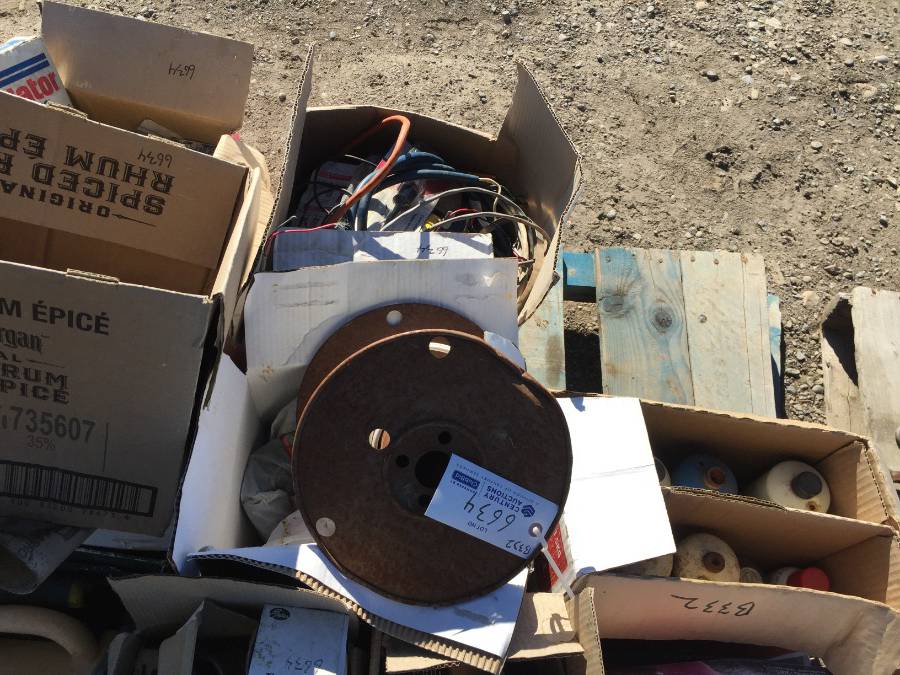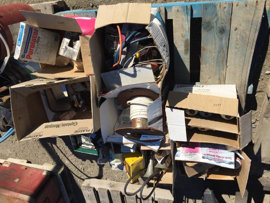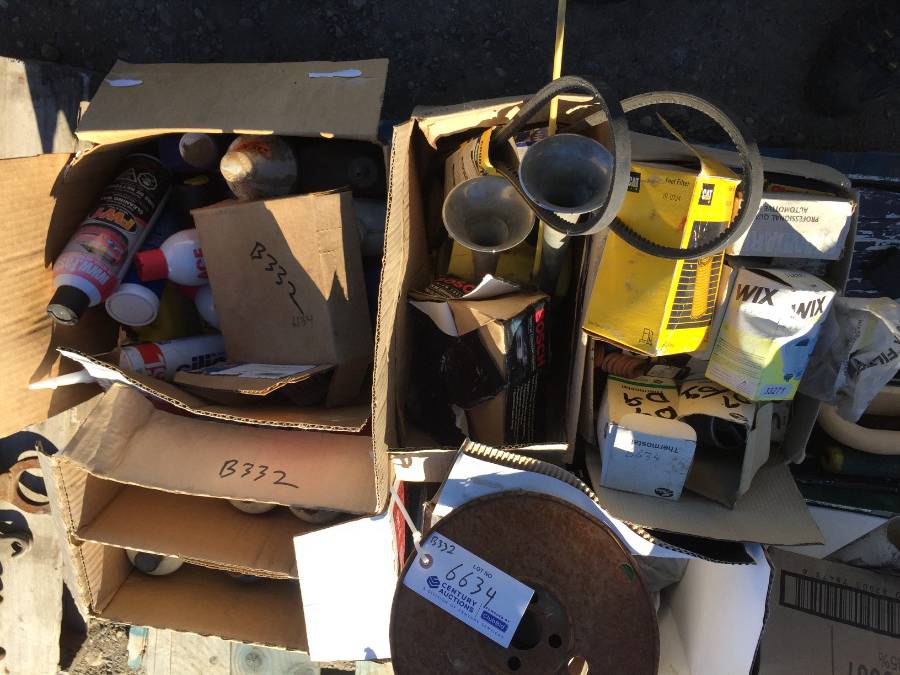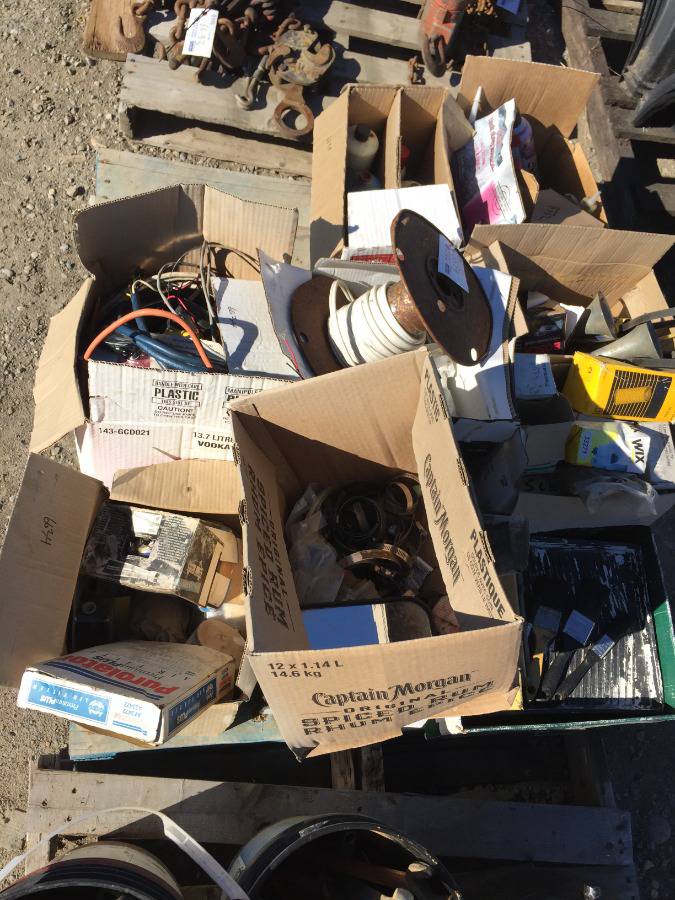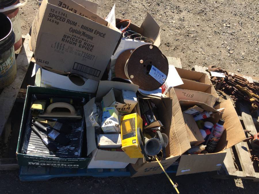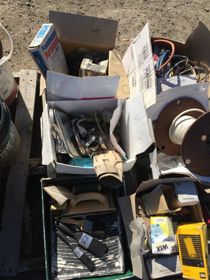 Lot #6634: Pallet of Assorted Automotive Parts, Electrical Wire, Paint Brushes.