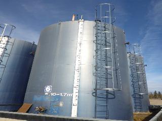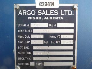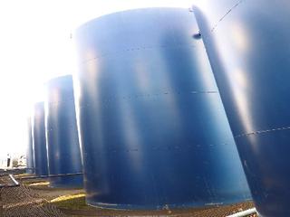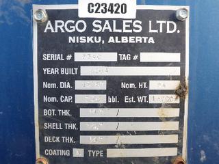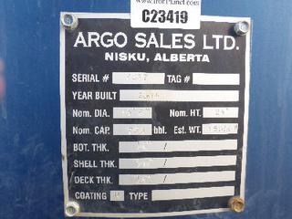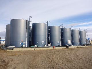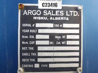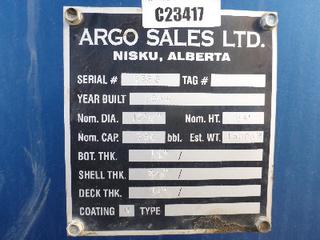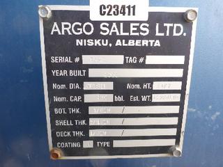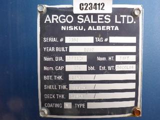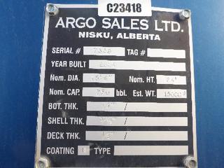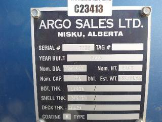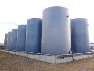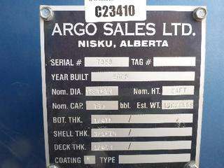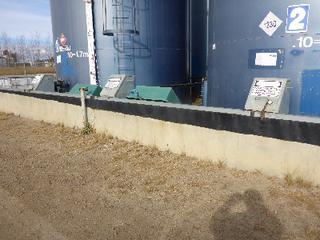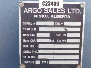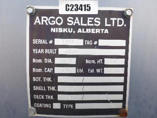 Lot #0950: Complete Tank Farm (6) 2005 Argo 750 BBL Skid Mounted Tanks, 4 In. Hose Piping, Gauge Board, Ringed Ladder, 15 Ft. 6 In. Diameter, 24 Ft. High, SN 7354, 7353,7352,7355, 7356, 7351 (6) 2004 Argo 750 BBL Skid Mounted Tanks, 4 In. Hose Piping, Gauge Board, Ringed Ladder, 15 Ft. 6 In. Diameter, 24 Ft. High, SN 7335, 7336,7338,7339, 7340 w/ Milepost, Approx. 3 Ft. x 340 Ft. Concrete Containment System, (16) 3 Ft. x 20 Ft. and (2) 3 Ft. x 10 Ft. Panels w/ (9) Loading Boxes, 3 In. Valves, Approx. 129 Ft. of 4 In. to 3 In. Steel Piping, Approx. 3 Ft. x 160 Ft. of Grated Catwalks *Note: All Tanks Have Had API 653 Inspections In September 2019, 2- Tanks Contain Methanol, Will Be Cleaned and Prepped* *Located Off Site at 291 26 St, Edson, AB T7E 1N9* *NOTE BUYER RESPONSIBLE FOR LOADOUT*