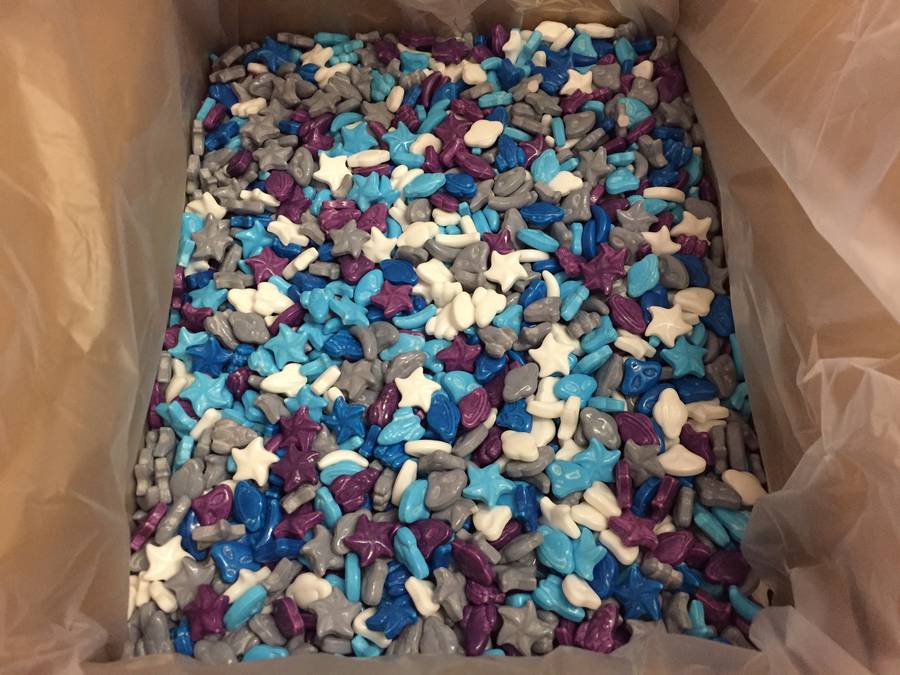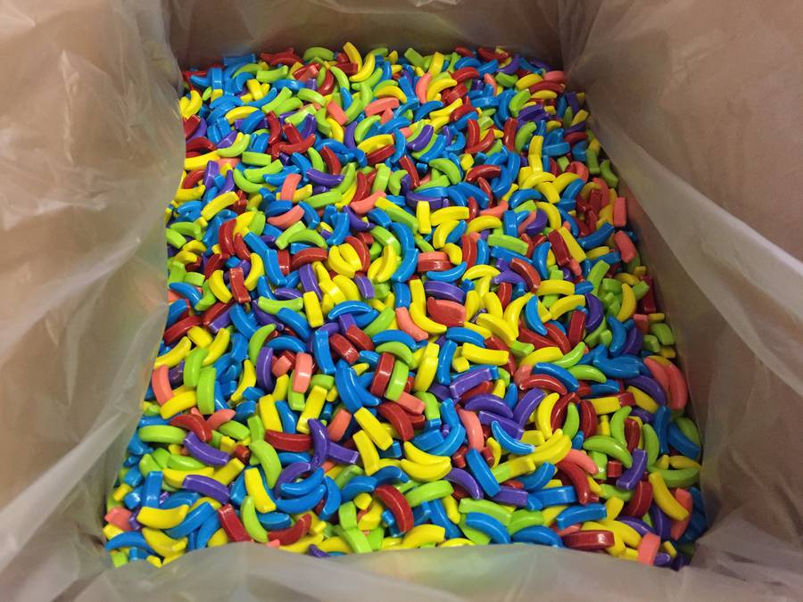Lot #8034: (3) Boxes of Concord Confections "Box of Fun" Candies. Kaboom Speckled Candy Centers, Crazy Bananas Fruit Candy - Coated, Spaced Out Coated Candy, Box is 9 1/2" x 12". Unknown Quantity.