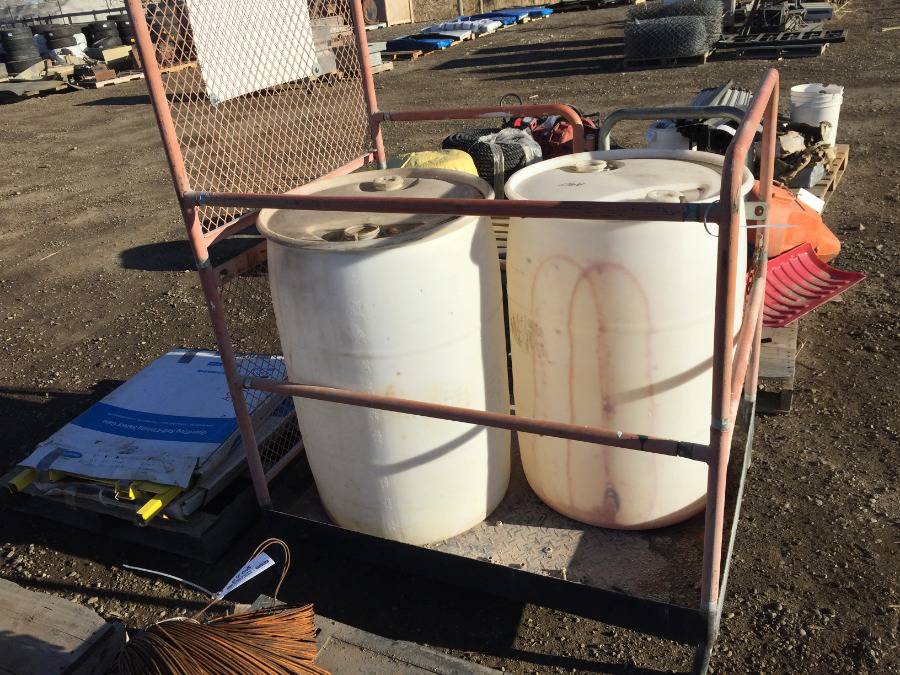 Lot #6407: Metal Safety Basket with Door 3' x 4' x 4' c/w (2) Empty Plastic Barrels.