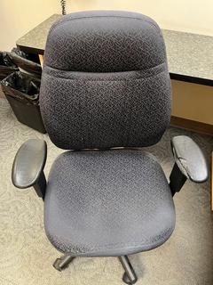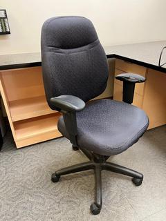 Lot #2525: L-Shaped Workstation with Drawers, Shelves & Keyboard Tray, 8'x 90" c/w Chair & Monitor Mount.