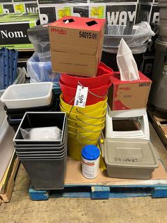 Lot #0409: Assorted Garbage Bins, Pails, Step Ladder, Eco Lab Hand Sanitizer, Etc.